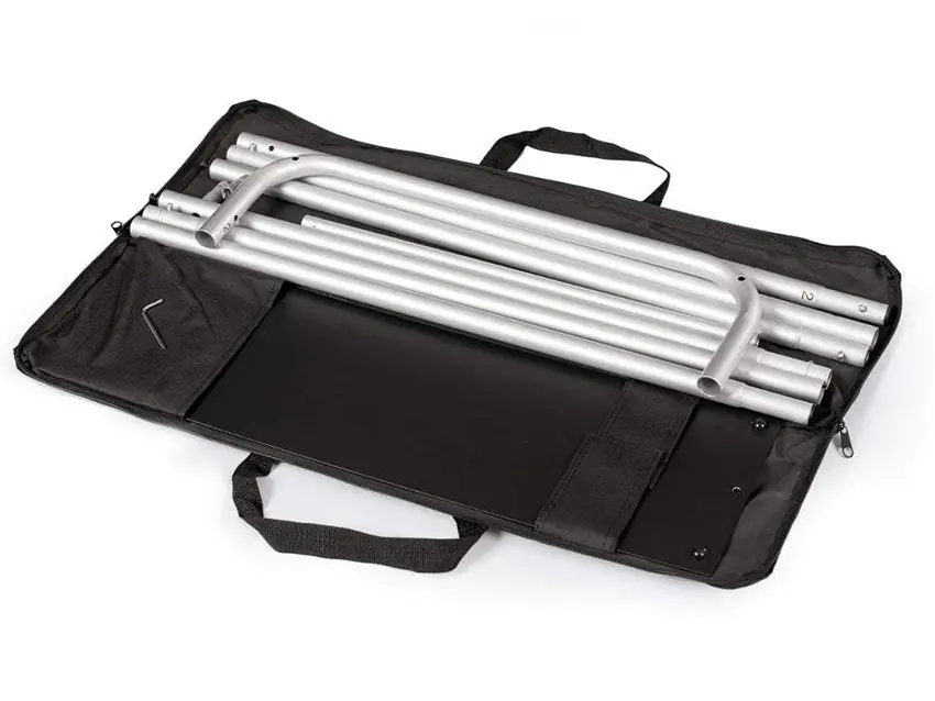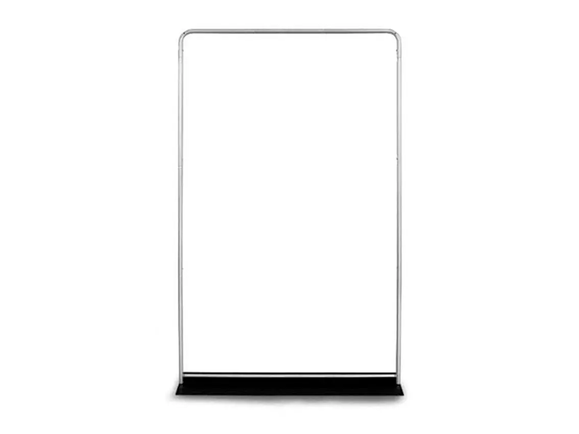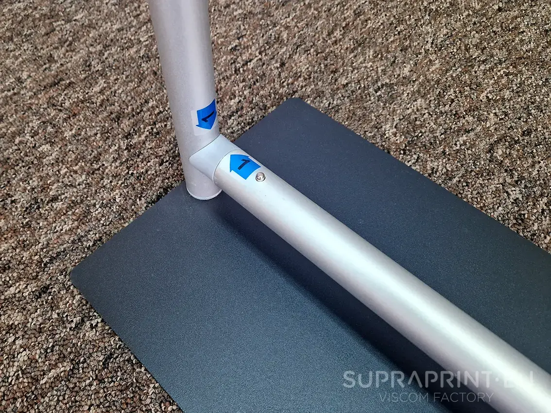 Das Herzstück des Systems ist ein leichtes, aber dennoch robustes Aluminiumprofil mit einem Durchmesser von Ø 25 mm. Anstelle klassischer Beine wurde eine Flache Stahlbasis, was die Stabilität der gesamten Konstruktion deutlich erhöht. Diese Lösung macht den Stand auch an Orten mit hohem Publikumsverkehr – wie Einkaufszentren, Messen oder Konferenzen – perfekt.