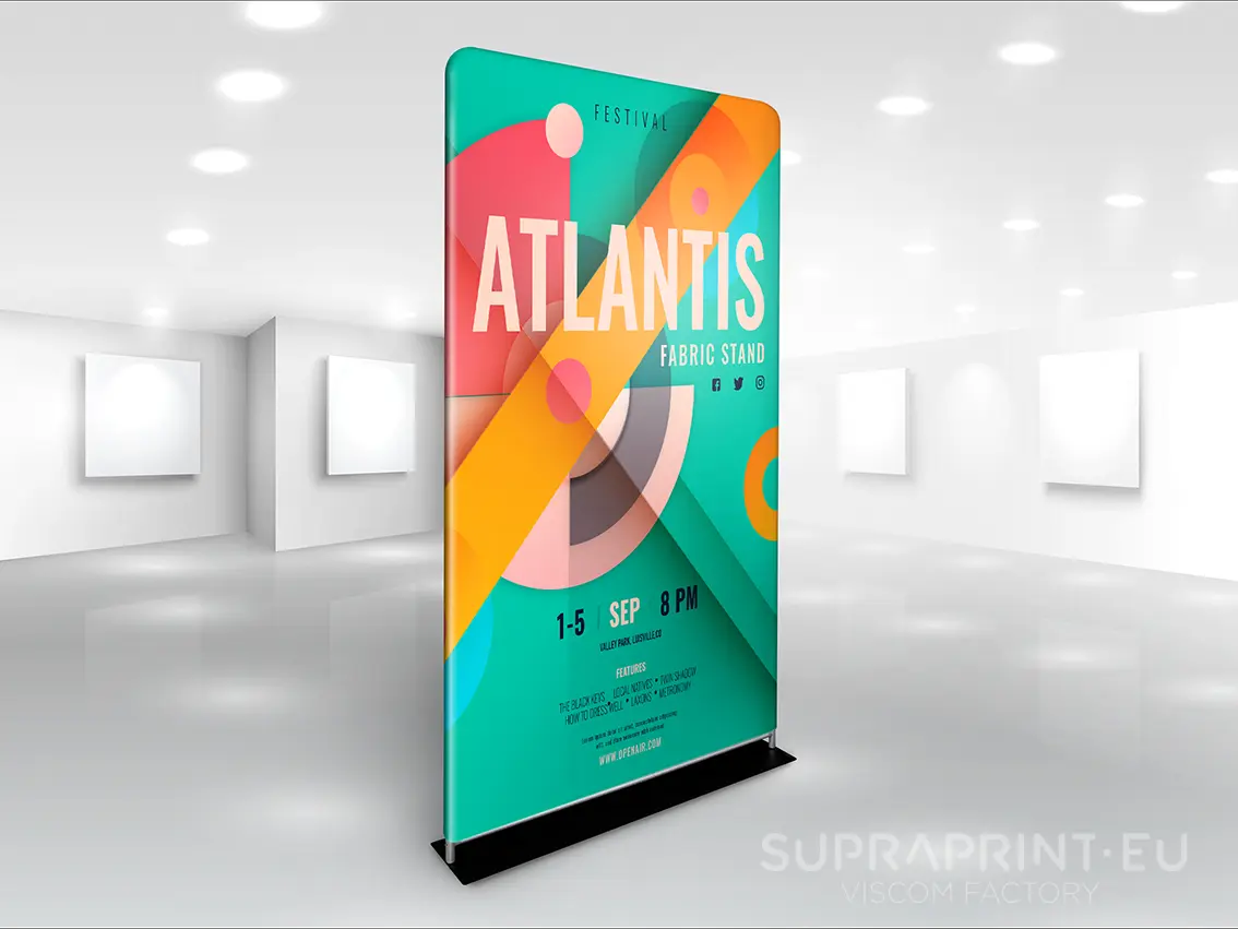 Stand Atlantis ist ein Ausstellungssystem, das aus hochwertigem, knitterfreiem Stretchgewebe besteht. Dank dieser Eigenschaft sehen Ihre Grafiken immer perfekt aus – ohne Falten oder Verformungen, selbst nach wiederholtem Transport. Darüber hinaus passt sich das Material perfekt der Struktur an und schafft so eine elegante, glatte Werbefläche.